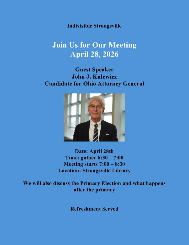 | Actions that We Can Take: 1. Contact our Senators and Congressman about: A. Your concerns about the dismantling of our democracy. B. The budget that is dismantling much of Health Care and Medicaid. 2. Write Letters to the Editor. Become a part of the group, For the Love of Democracy – Speak Up! 3. Have you donated to the candidates for Congress, Senate, City Council, School Board and Ohio’s next Governor and Cabinet? 4. Attend the Indivisible Strongsville monthly meetings and other gatherings. 5. Volunteer to help with tasks within Indivisible Strongsville. |